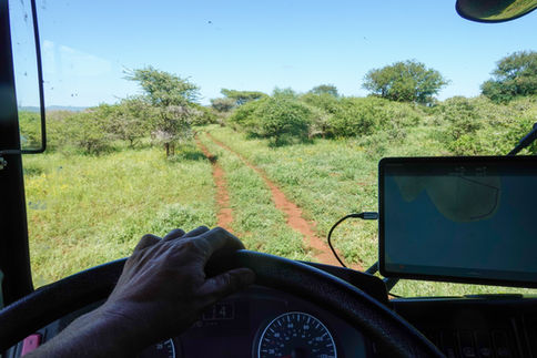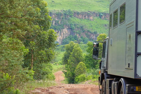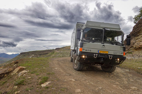 It's incredibly quiet in the truck. Every now and then, a muffled scream and a pale face. We're on a track completely washed away by the rain. Large, gaping gullies and deep ravines. It's a lot of work. Low gear, and step by step, up or down. Anything to keep the 12-ton elephant from falling or sliding away. One of us is enjoying it, the other is a bit more tense. It's pure mindfulness. All senses are engaged, and total focus is on the track, the truck, and the elements. The Sani Pass was more of a warm-up.