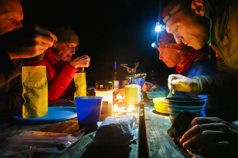 Dus op de camping...nee, bivak, toch maar gepeuzeld aan droogmaaltijden en poffertjes bakken boven een gasbrander. Avonturier zijn heeft zo zijn grenzen.